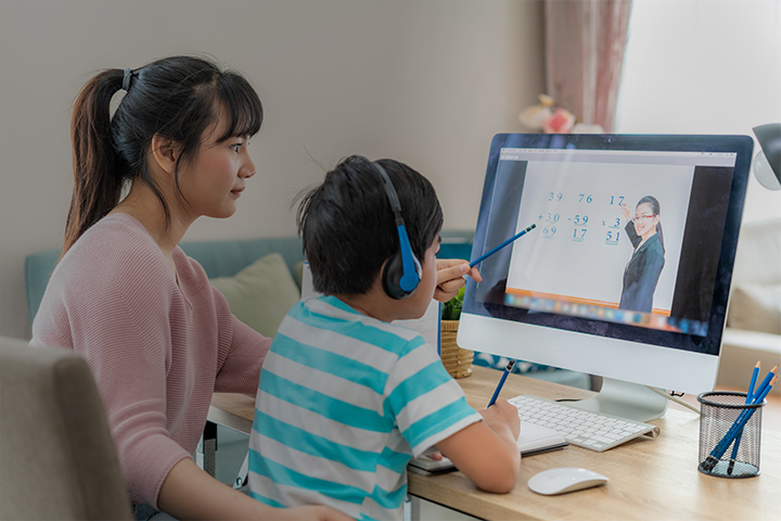 Gallery Asian boy student with mother video conference e-learning with teacher on computer in living room at home. Homeschooling and distance learning ,online ,education and internet.